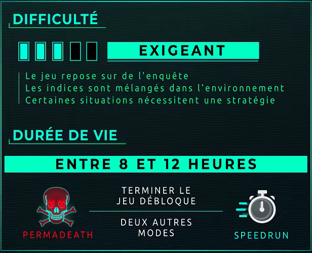 • Le jeu repose sur de l'enquête et la difficulté varie principalement en fonction de la quantité d'informations que vous collectez : moins vous en avez, plus la difficulté est grande