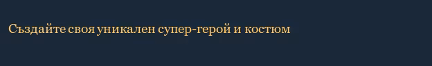 Вашият външен вид и костюм могат да се променят по всяко време и са независими от вашите свръх-сили. Персонализирайте лицето, тялото и костюма на героят си. Изберете от десетки хиляди възможни визии и комбинации от костюми. Комбинирайте и съчетавайте свободно от различни елементи. Сменяйте цветовете. Възможностите са безкрайни! Комбинацията може да промените по всяко време без това да попречи да придобиете нови свръх-сили или да вдигнете нивото на героят си. Напишете историята на героя си, а другите играчи ще могат да я прочетат.