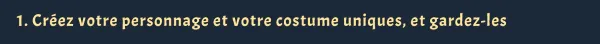 Votre apparence et votre costume sont indépendants de vos pouvoirs. Personnalisez le visage, le corps et le costume de votre personnage. Choisissez parmi des dizaines de milliers d’apparences et de combinaisons de costumes possibles. Combinez. Colorez. Les possibilités sont infinies ! Vous pouvez les changer à tout moment, et vous n’avez jamais à renoncer à un costume bien-aimé pour gagner des pouvoirs ou monter en niveau. Écrivez l’histoire de votre personnage pour que les autres joueurs puissent la lire.