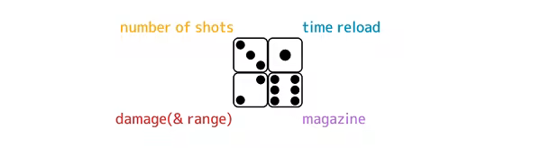 • The combination of the dice determines the turret's ability values, such as "number of shots", "time reload", "damage(& range)" and "magazine".