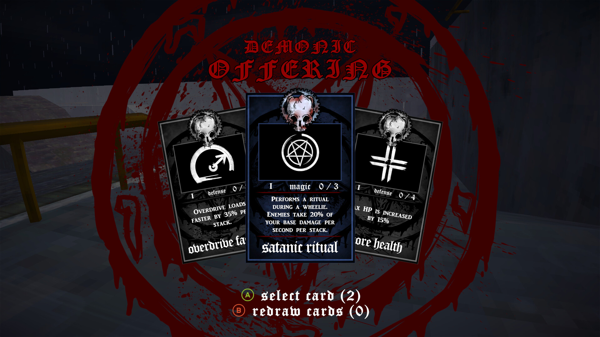 Demonic Offerings come in the form of cards. Build your deck by choosing the right cards for your build. Unlock new cards for later runs to be prepared for the horrors Motördoom has to offer.