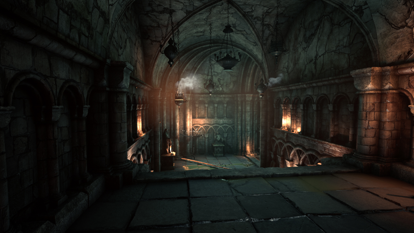 The central part of the burial site is a vast circular chamber held by thick marble columns. A densely decorated crypt occupies the middle of the room. Labyrinth-like corridors head in all directions from here, with countless statues and decorations, lined up on their walls. Smoke hangs from the top of the chamber, covering the rooms in a mysterious mist. The floor is covered with stumps of long-burned candles. One door leads to a semicircular hall, at the end of which stands a huge throne at the top of a staircase. The sides of the stairs are covered with hundreds of skeletons, and on the ancient throne sits a two-people-tall skeleton with a matching sword in its hand.