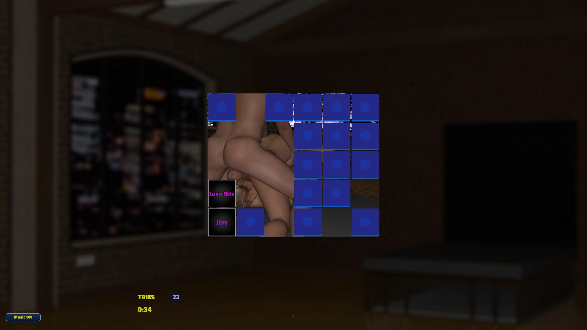 Flip two cards, and if the words on them match, they will be removed from the board, revealing a unique image from threesome sex adventures in a fancy loft.