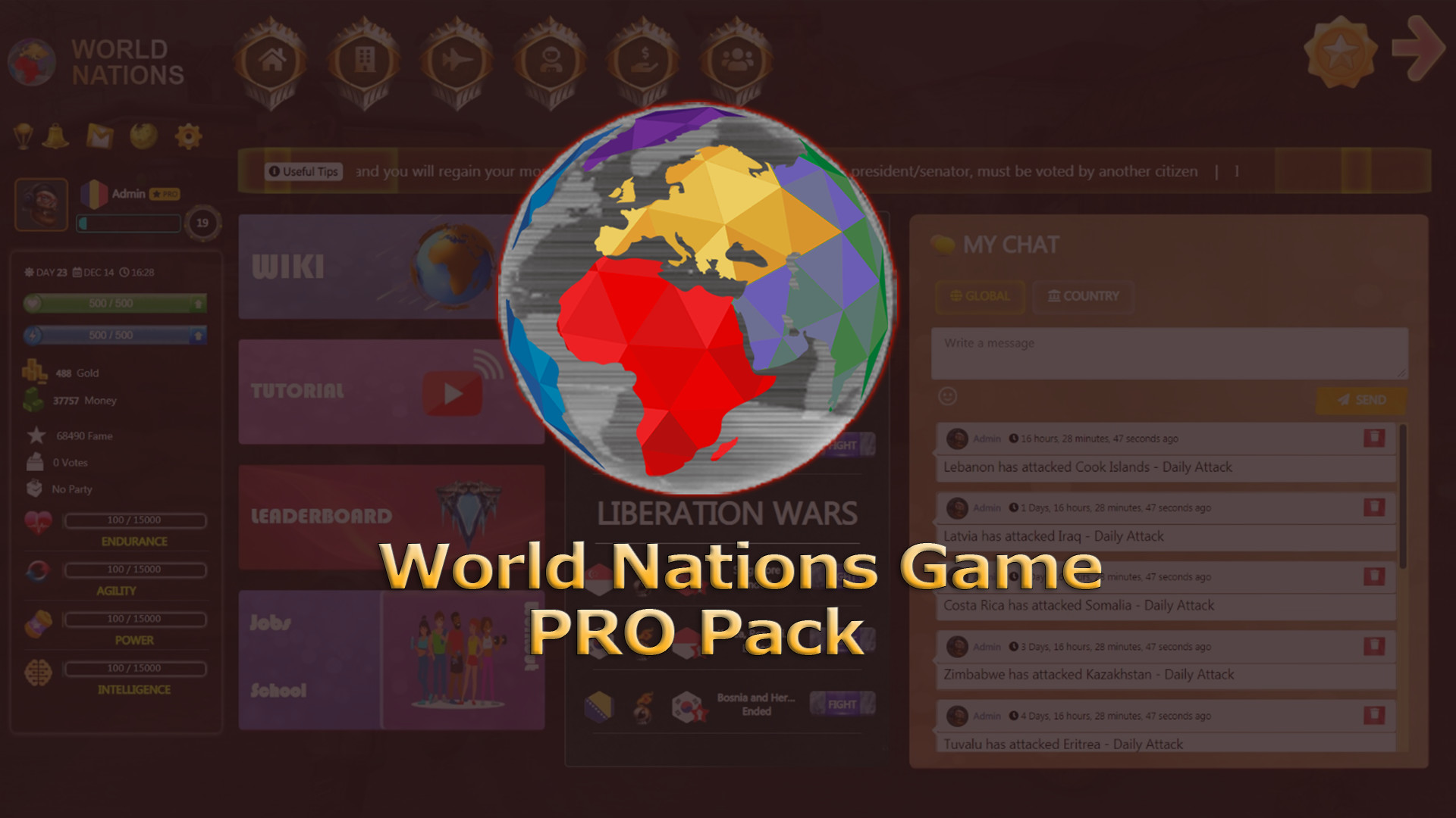 World Nations Game - PRO Pack has materialized to fill the citizens coffers with some great rewards and a multiverse of World fun. Loaded full of exclusive features and grand rewards — including lifetime PRO Membership; Awesome PRO items from each shop category; A good pack of money and gold; Q5 Energy Boosters and Health Kits — this PRO Pack holds a vault of riches and adventure in store.