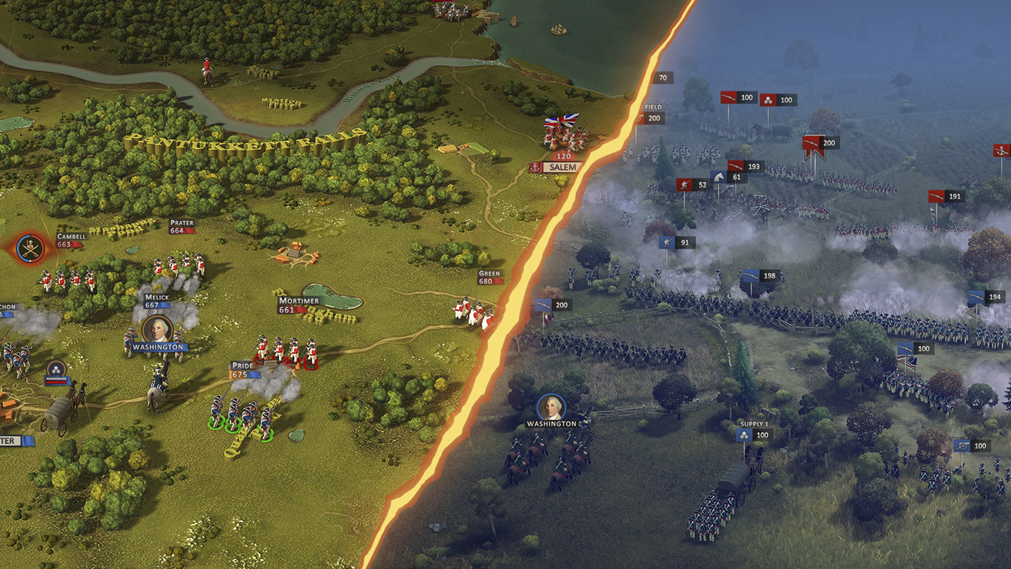 Take on the role of the American Colonists, and fight for territorial control over North America. A gripping real-time campaign awaits you on a detailed 3d map where you can build your army and navy, construct military infrastructure, and fully command your armies on a regimental level. If you want even more action you can fully zoom-in and fight massive battles on a battalion level.