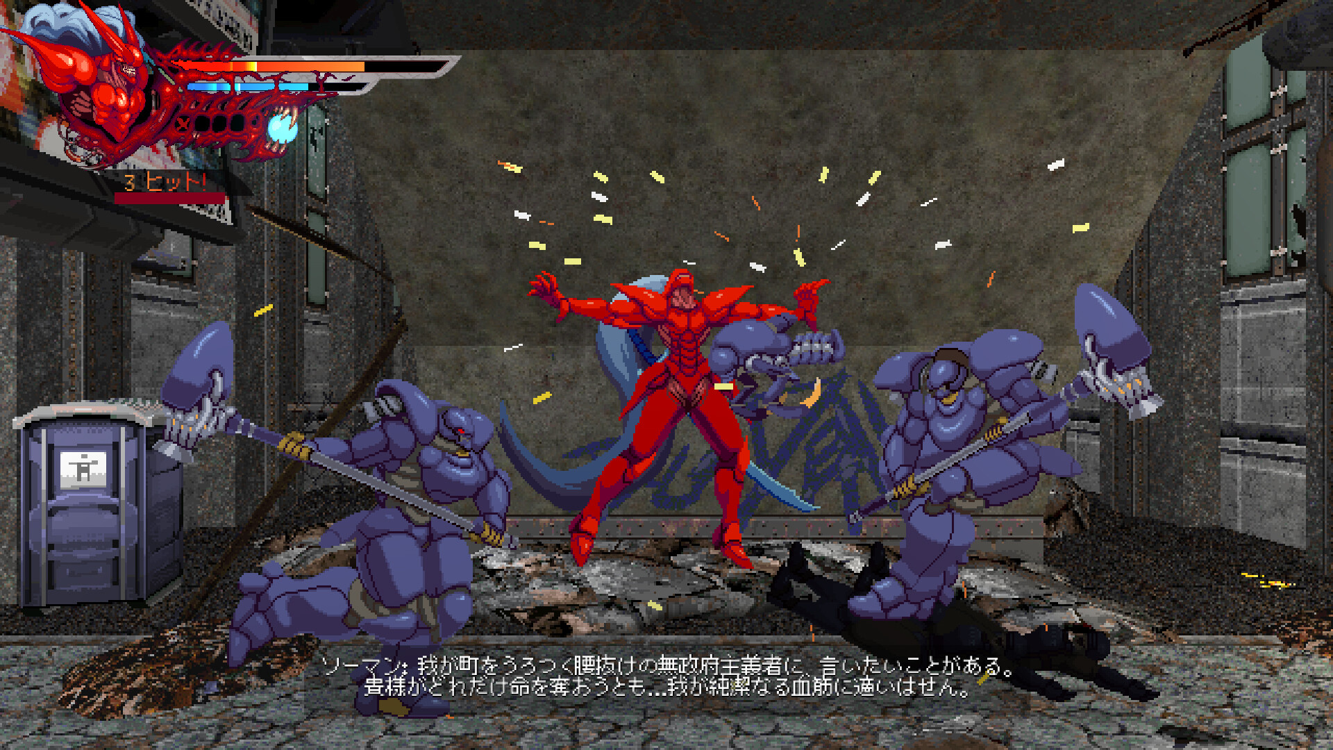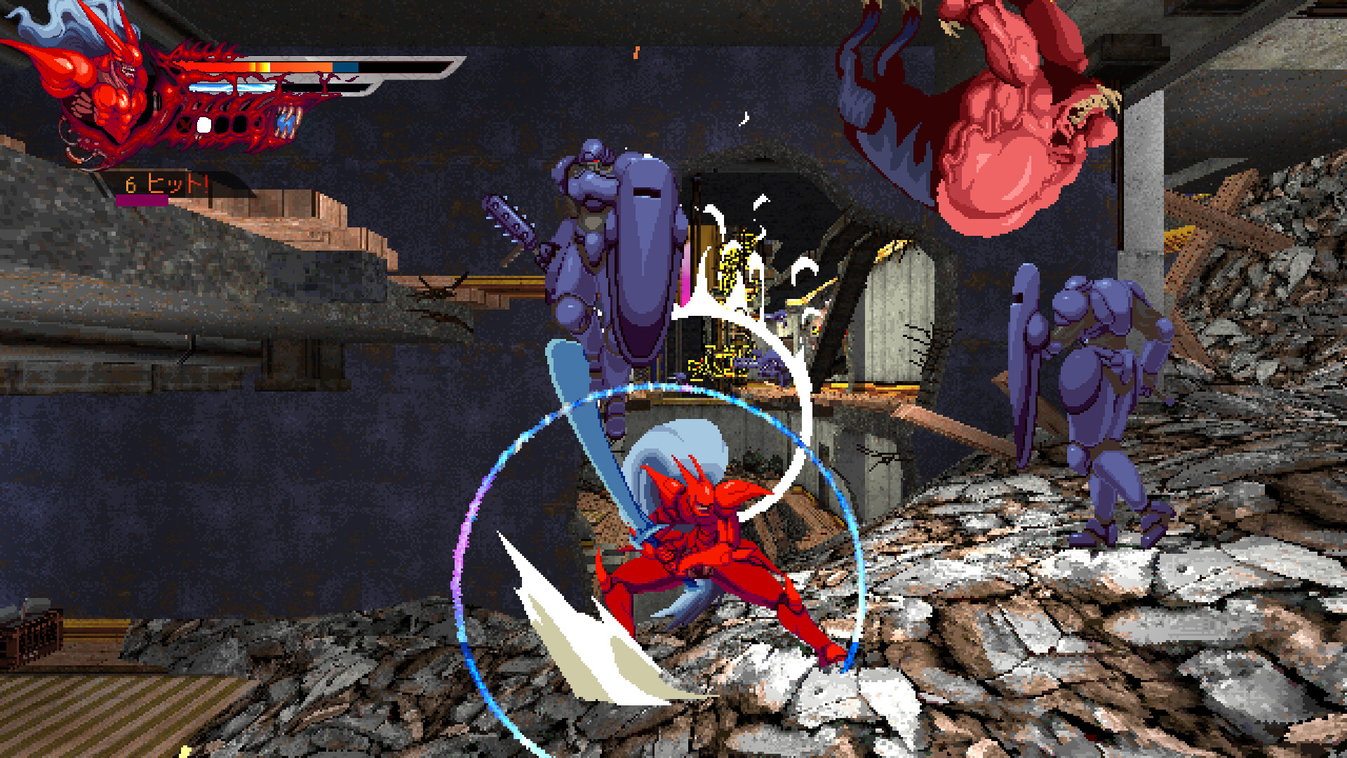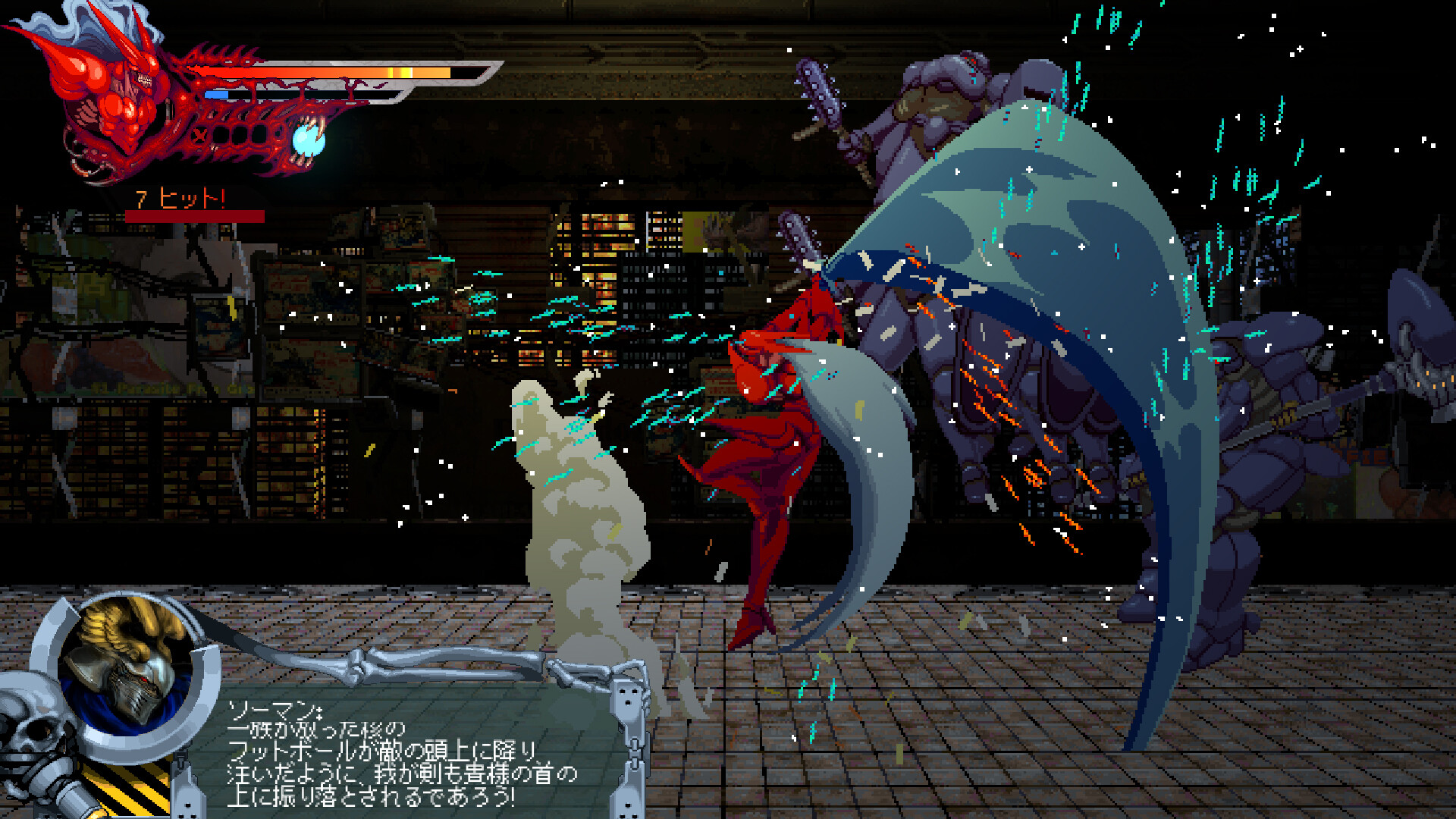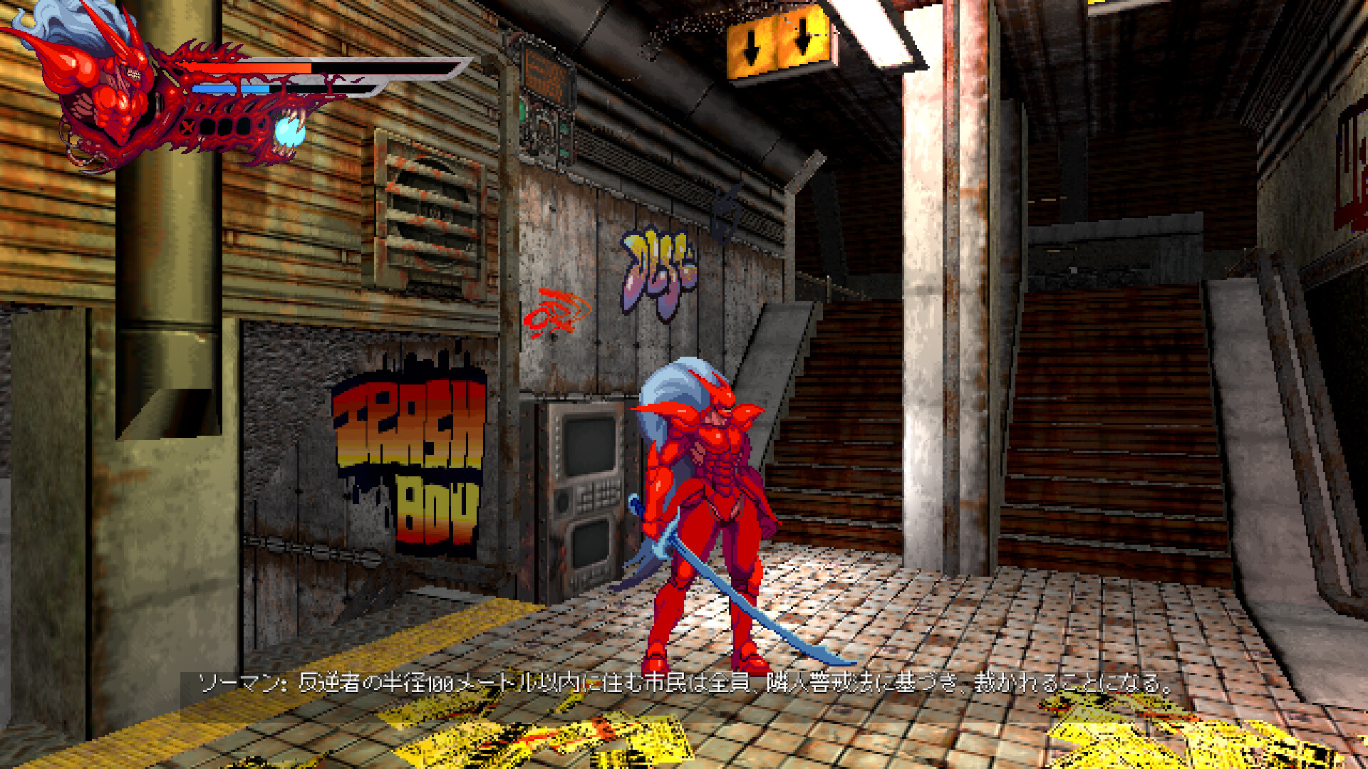 た、2.5Dのスタイリッシュアクションゲームです。敵を切り裂きながら、未来のディストピア
