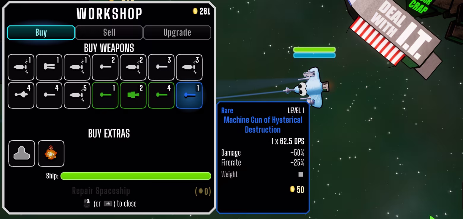 • Collect EXP to upgrade your ship with randomized level-ups.