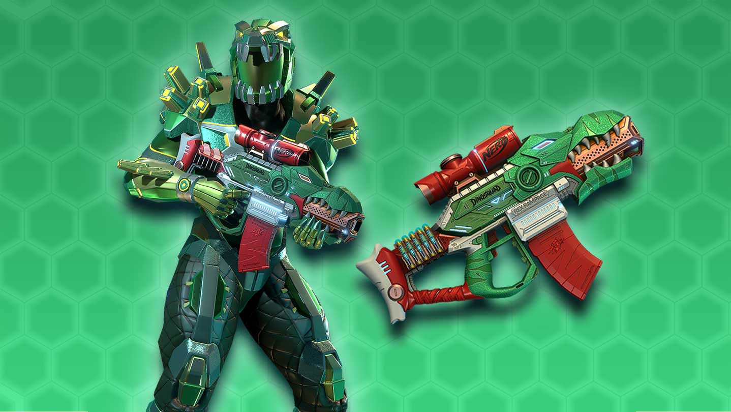 Take a major bite out of your opponents with the NERF DinoSquad Rex-Rampage blaster and custom suit featuring awesome T-Rex detailing. Load out with this King of the Dinos blaster and suit in both single player and multiplayer modes. The blaster and suit each come with 4 additional skin variations to customize your T-Rex-look! Upon downloading these items, they will be available from the customization menu.