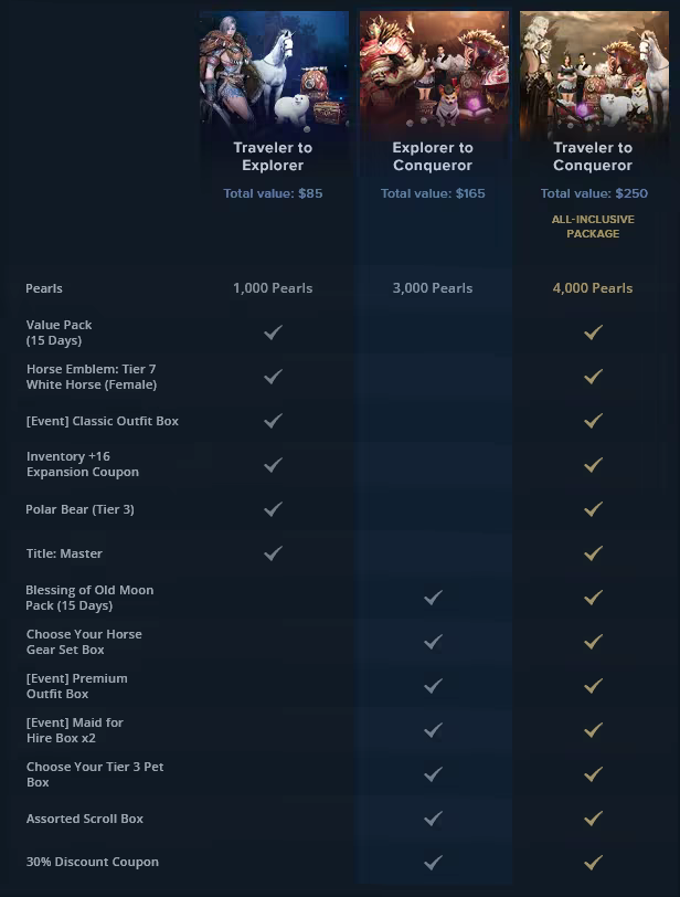 Includes 3 items: Black Desert, [NA/EU] Traveler to Explorer DLC, [NA/EU] Explorer to Conqueror DLC