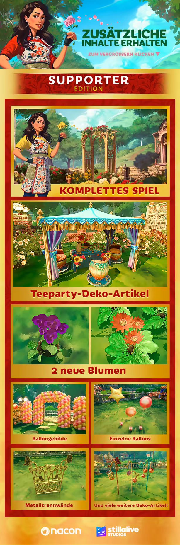 Du bist für einen verlassenen Gemeinschaftsgarten verantwortlich und beschließt, die Ärmel hochzukrempeln, um ihn in neuem Glanz erstrahlen zu lassen. Hilf deinen Nachbarn , um Belohnungen zu erhalten, schalte neue Werkzeuge, Samen, Dekorationen und Bereiche des Gartens frei.Erfahre mehr darüber, was sich hinter diesem abgelegenen Ort verbirgt und lerne deine Nachbarn besser kennen.