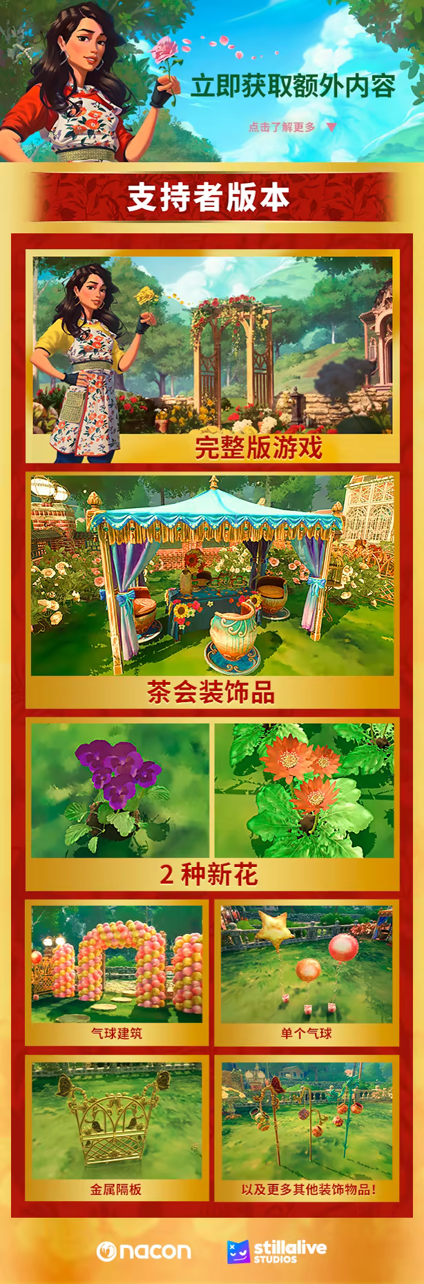 你负责一片弃置的社区花园,决定卷起袖子,重振昔日辉煌。完成邻居交给你的任务来获得奖励,解锁新工具、种子、装饰物和花园领地,并了解这僻静一隅背后是什么。