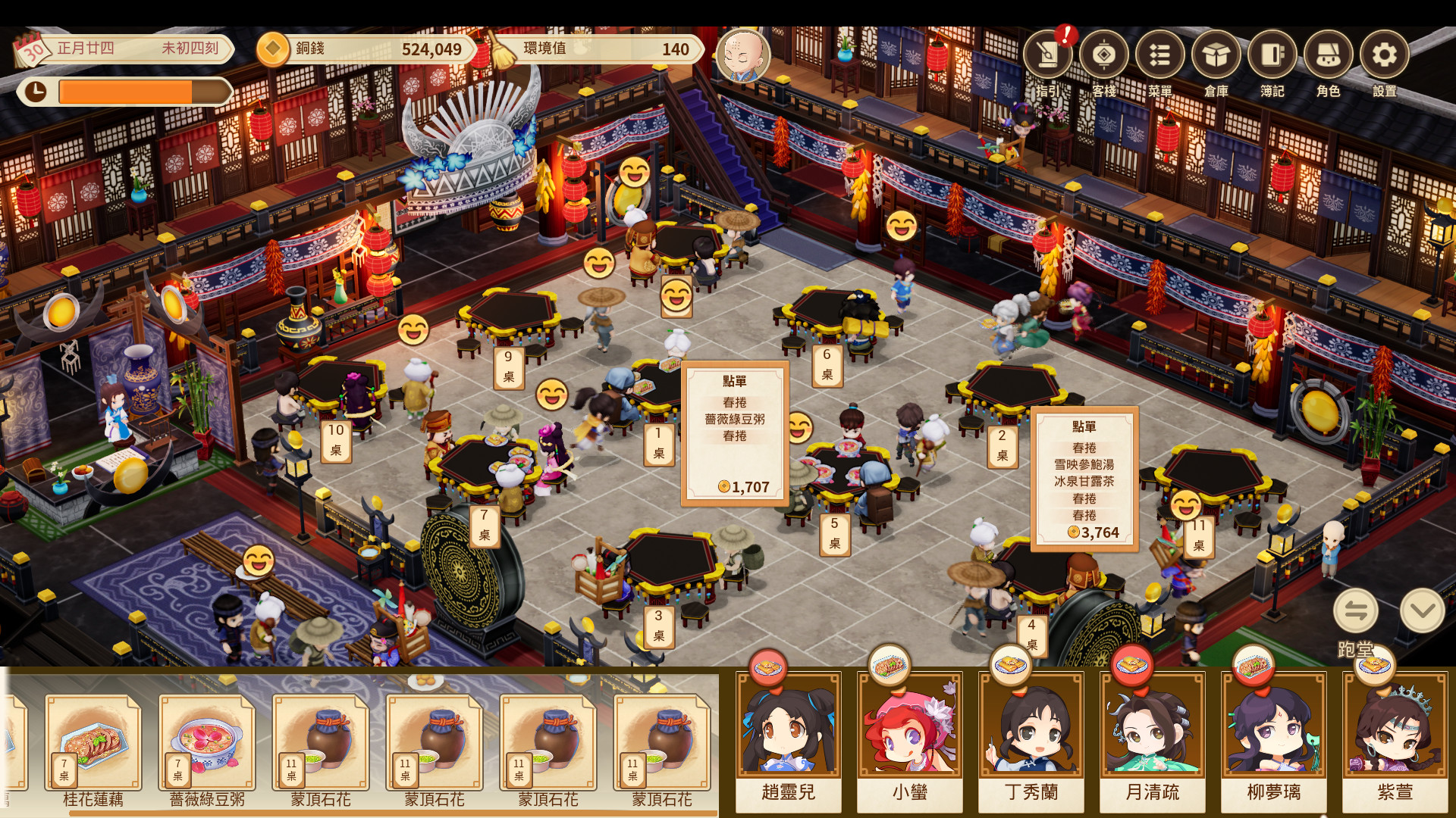 研究提升各式佳餚美食,獲得每日來店客人的優良評價,提高客棧名聲等級。
