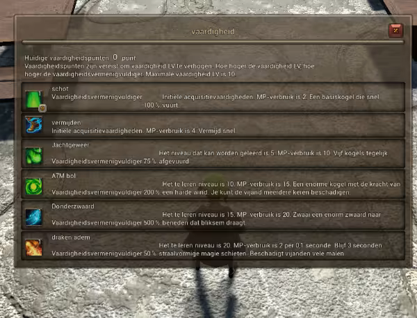 Door vaardigheidspunten te gebruiken, kun je het vaardigheidsniveau verhogen vanuit het vaardigheidsvenster.