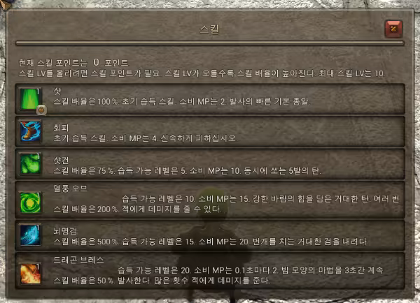 스킬 포인트를 사용하여 스킬 창에서 스킬 레벨을 올릴 수 있습니다.
