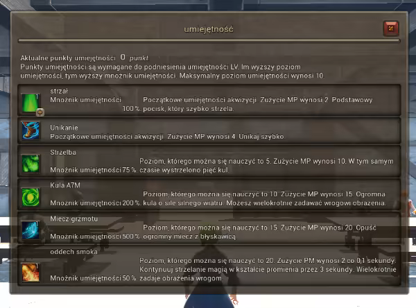 Korzystając z punktów umiejętności, możesz podnieść poziom umiejętności z okna umiejętności.