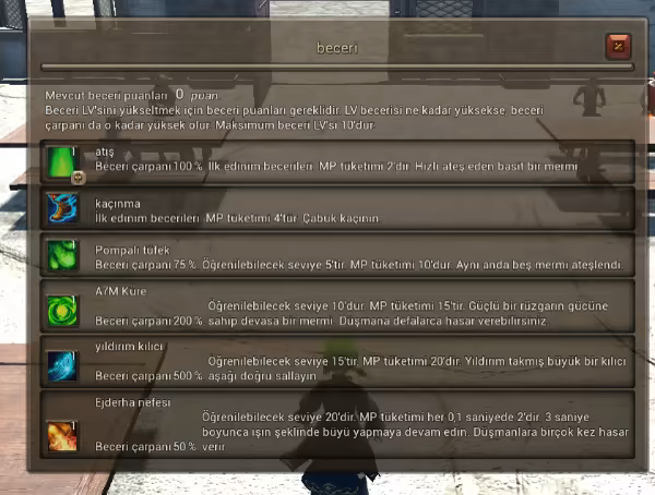 Beceri puanlarını kullanarak, beceri penceresinden beceri seviyesini yükseltebilirsin.