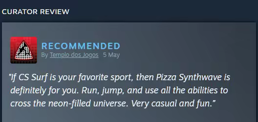 Pizza Synthwave is a fast paced parkour game where you have to get to the pizza at the end of each level using your speed, quick reflexes and abilities. Wallrun, jump, climb, use your grappling hook and portals to get the fastest time! Set in a gorgeous neon world. For fans of Mirror's Edge, Beat Saber and CS:GO Surfing.
