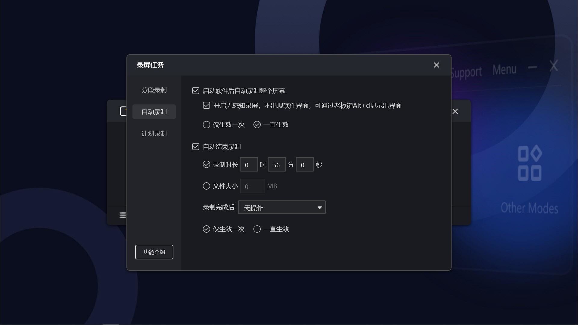 • 可设置自动开始录制、自动结束,及根据视频时长和大小自动分段保存。