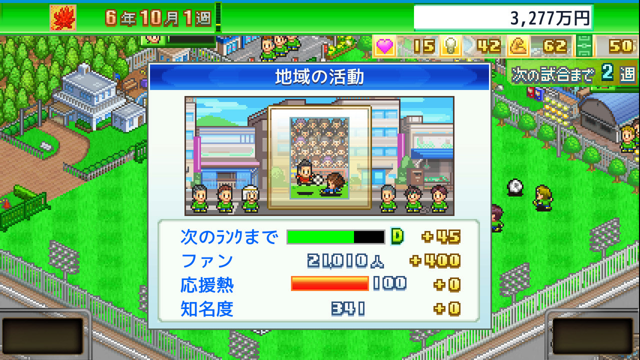ホームグラウンド周辺には「グッズ屋」「温泉」「最新ジム」など施設を建てられ、選手育成やファンの獲得に役立ちます。