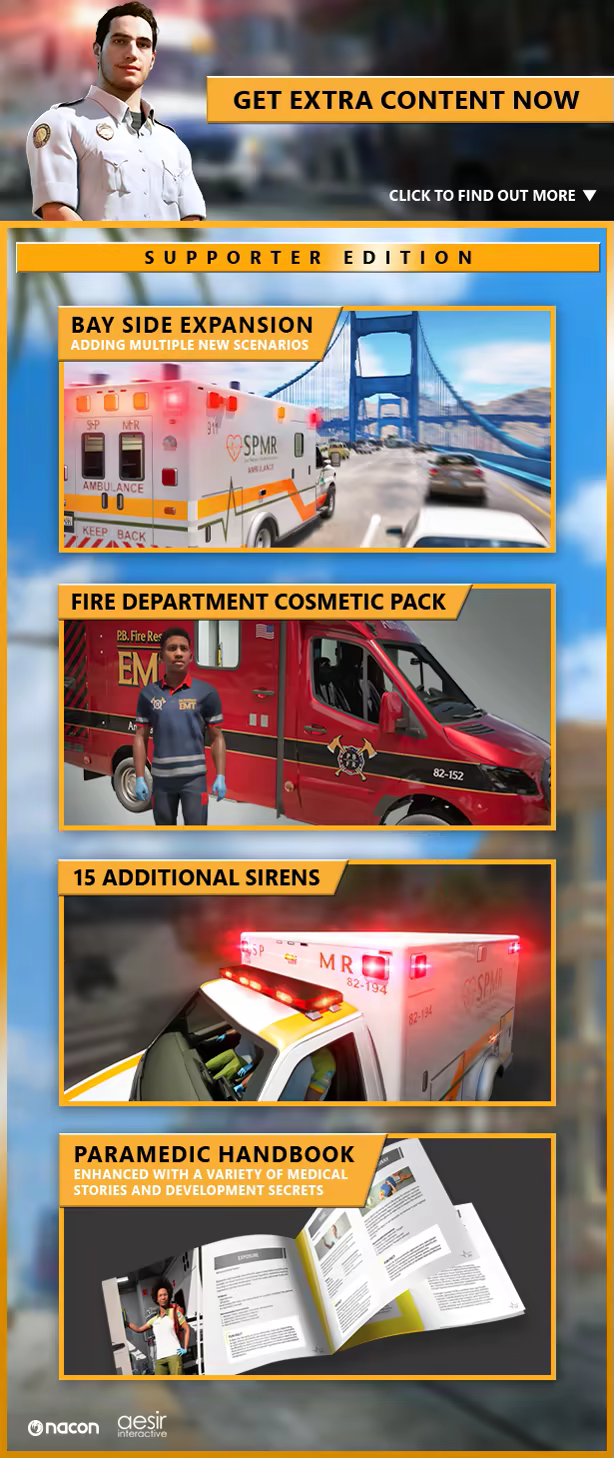 Developed by the creators of the groundbreaking Police Simulator: Patrol Officers, Ambulance Life: A Paramedic Simulator is the first simulation game in which you experience every aspect of a paramedic’s life. Your objective? Quickly reach the accident site at the wheel of your ambulance. Your mission? Take care of the injured and apply first aid. Each accident is different. It's up to you to adapt and make the right choices while being fast and efficient.