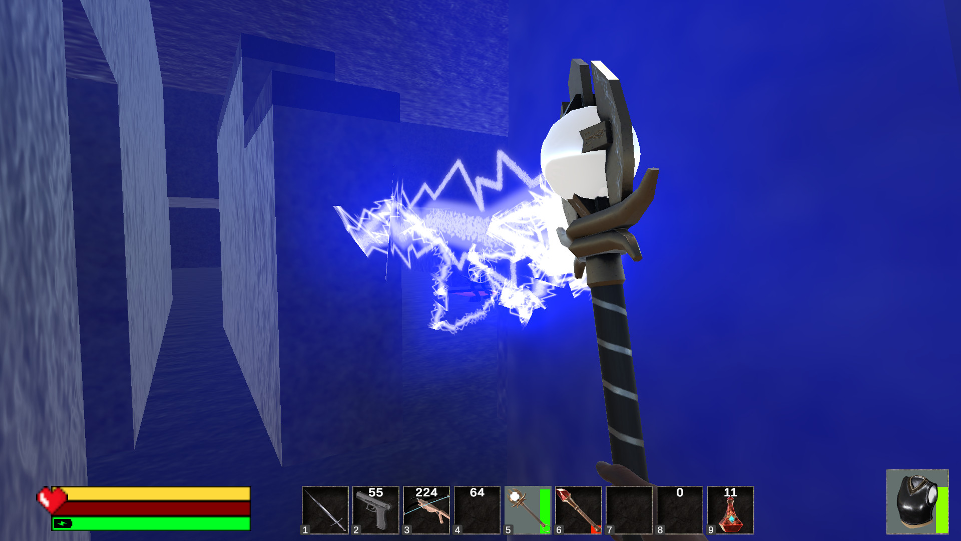 Each level is a new and unique, generated once and never seen before or again. Caverns of Evil does not use pre-fabricated rooms or level sections, but generates the layout and geometry of each room and level, creating some truly unique rooms on every run.