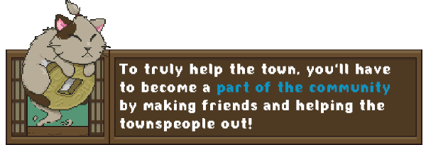 This is- well... used to be a nice town, but there have been some strange goings-on lately! You're going to find the spirits causing mayhem and fix their problems so they can become paying customers, and get to know the townspeople and explore the mountain to its fullest!