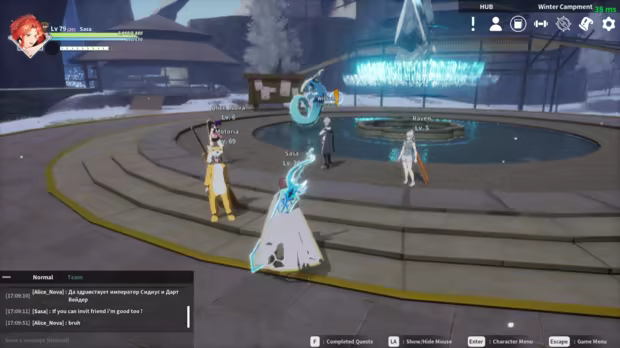 Gather in the central hub to meet NPCs, pick up quests, and craft items. Play offline or join dedicated servers to interact with other players.