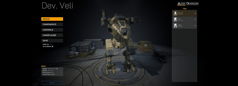 After preparing your setup, dive into the visual customisation. Add decals, edit the camouflage, change colours for each mech region, and more.