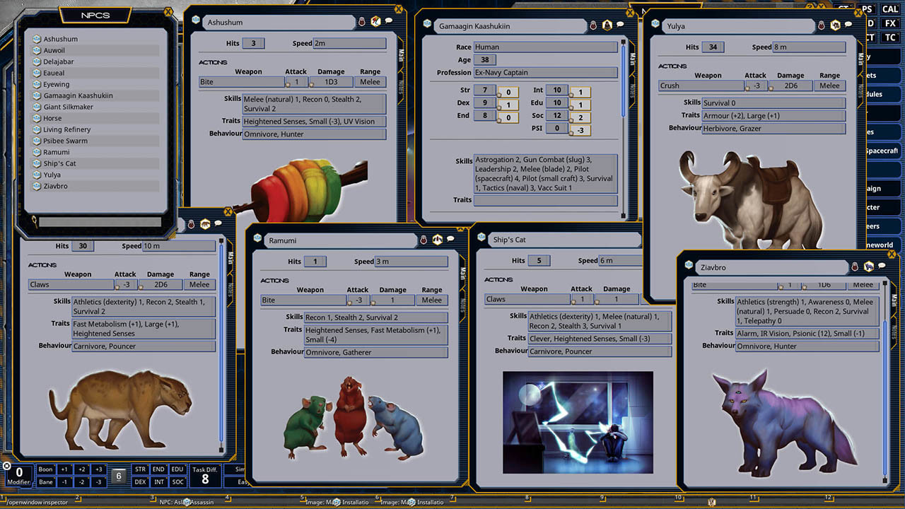 • Bestiary: Ashushum, Auwol, Eaueal, Eyewing, Giant Silkmaker, Horse, Living Refinery, Psibee, Ramumi, Ship's Cat, Ziavbro