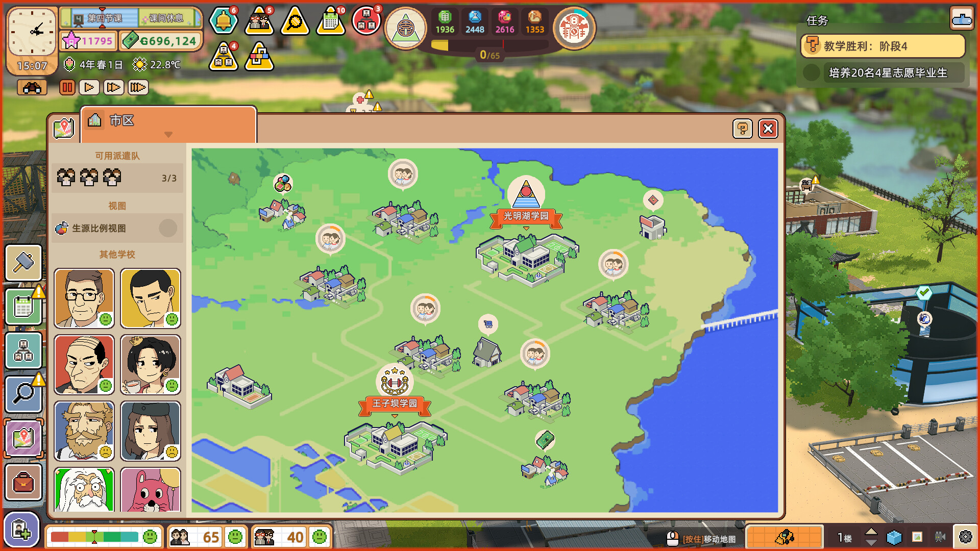 作为玩家的校长们,可以在建设完成之后,化身第三人称的模式,实时走进自己的校园,去观察师生们的生活。当然你也可以生硬地去阻止他们的一些行为,因为你是校长。。