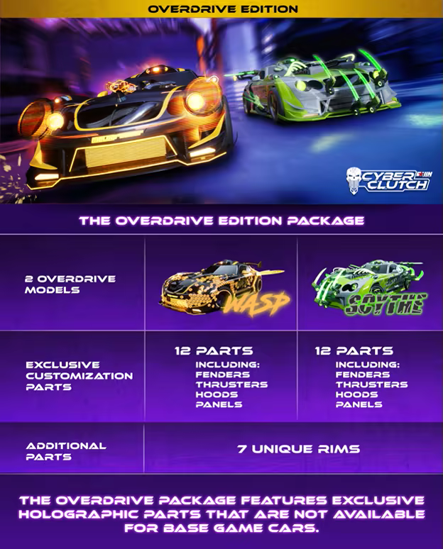 The Overdrive Edition offers two exclusive vehicles: the Wasp and the Scythe. Both come with unique holographic parts unavailable for any other vehicle in the game. It's the perfect way to stand out in races.