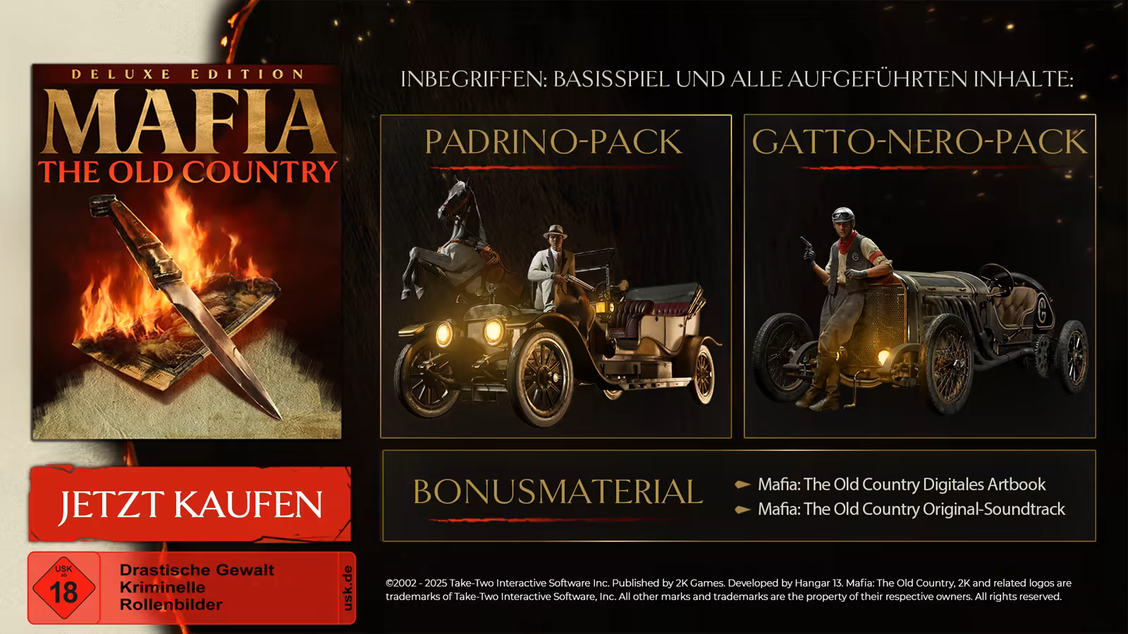 Die Mafia: The Old Country Deluxe Edition lässt dich in echter Mafioso-Manier in die kriminelle Unterwelt Siziliens absteigen und bietet eine Vielzahl von Bonusgegenständen für deine Sammlung.