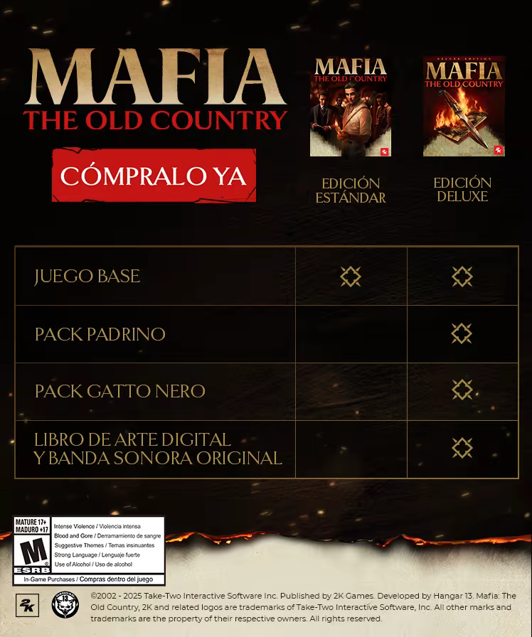 Descubre los orígenes del crimen organizado en Mafia: The Old Country, una cruda historia de mafias ambientada en el brutal submundo de la Sicilia del siglo XX. Lucha por sobrevivir como Enzo Favara y demuestra tu valía a la Familia en esta inmersiva aventura de acción en tercera persona, ambientada en una época peligrosa e implacable.