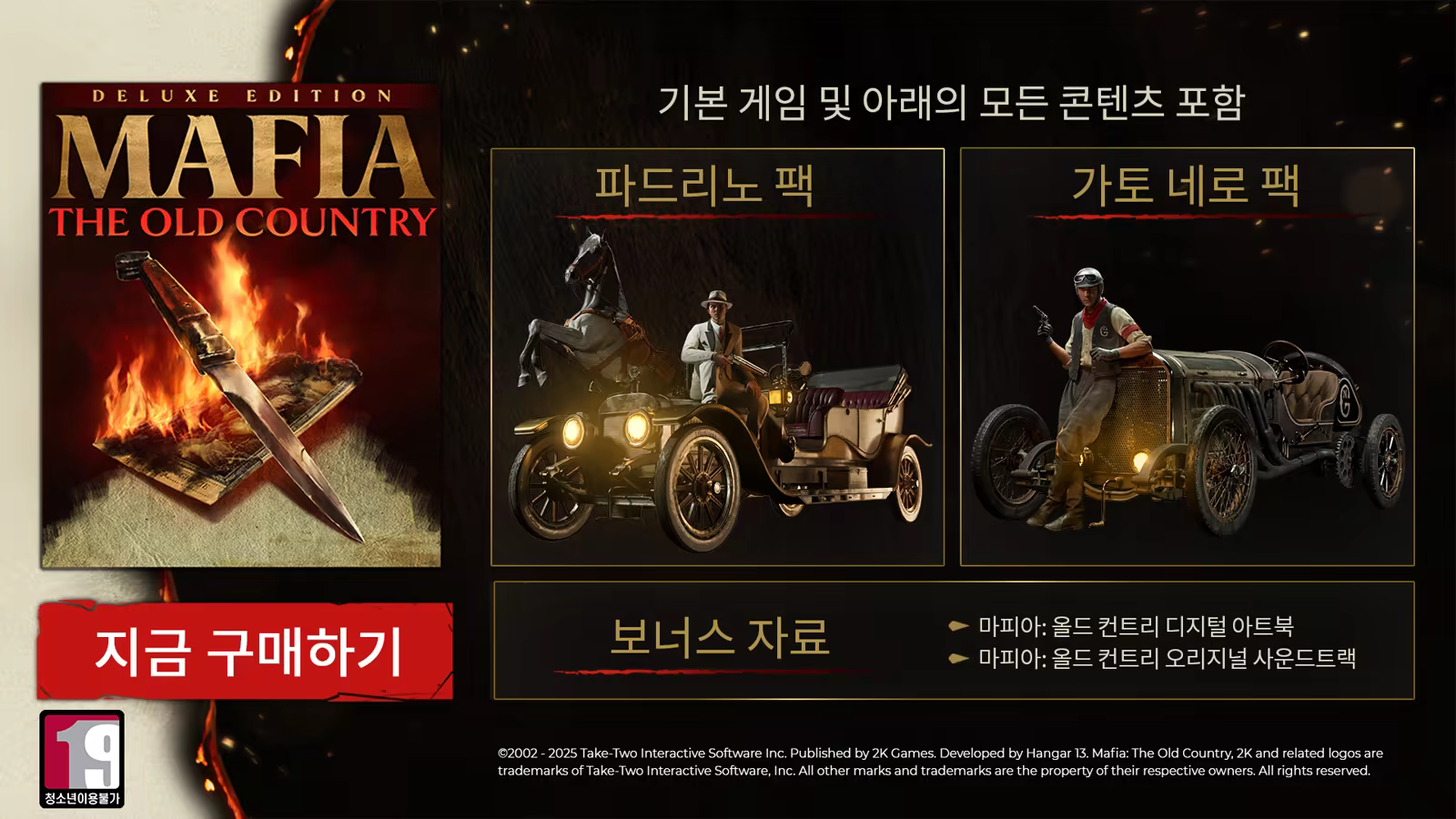 마피아: 올드 컨트리 디럭스 에디션을 구매하면 컬렉션을 위한 다양한 보너스 아이템으로 진정한 마피오소 스타일로 시칠리아의 범죄 지하 세계에 몸담을 수 있습니다.