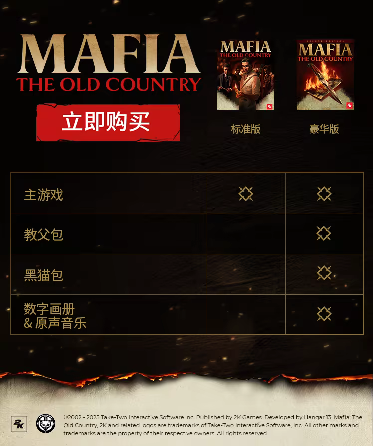《四海兄弟:故乡》豪华版将带给你一系列奖励物品,丰富你的收藏,让你以真正的黑手党风格深入西西里的帮派世界。