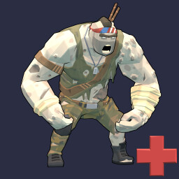 Can take quite a few hits. Carries a stun grenade and a sling full of high calibre ammo.