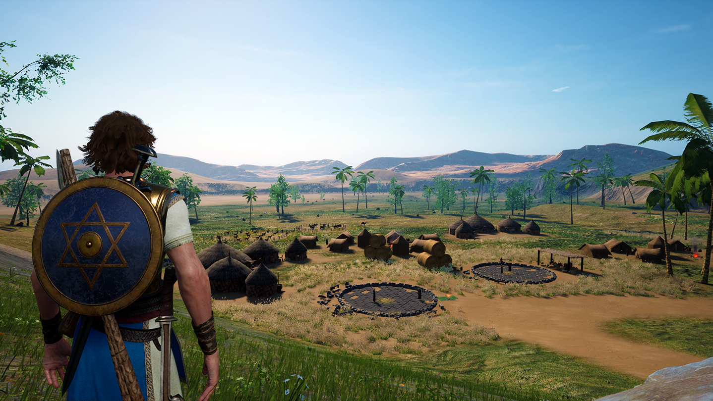 Although the story is linear, there are plenty of things to discover and many paths to take to fulfill each part of David's mission to save Keilah. There is a vast open-world feel with no time limits between objectives. There are loud thunderstorms and bright sunny skies, and David has a torch to light his way inside dark rooms/areas. Dialogues and Scrolls of information (Scripture) help guide David on the right path, while providing invaluable lessons. And, there are videos (Prayer Tips) that help the player navigate the challenges ahead. David's sling, staff, sword and spear are very useful weapons against the Philistines, the wild animals, and all the enemies of David - but Stealth and patience can be the most rewarding strategy. The Vitality, Righteousness, and Empowerment meters reflect the state of David during gameplay.