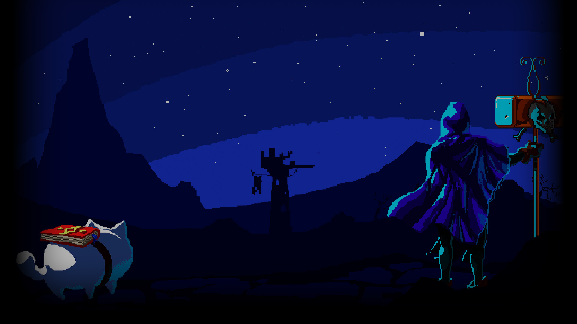 In a dark, dark tower a dark, dark Necromancer is performing a dark, dark ritual as dark, dark clouds swarm… Wait a second! What is a white cat doing here?