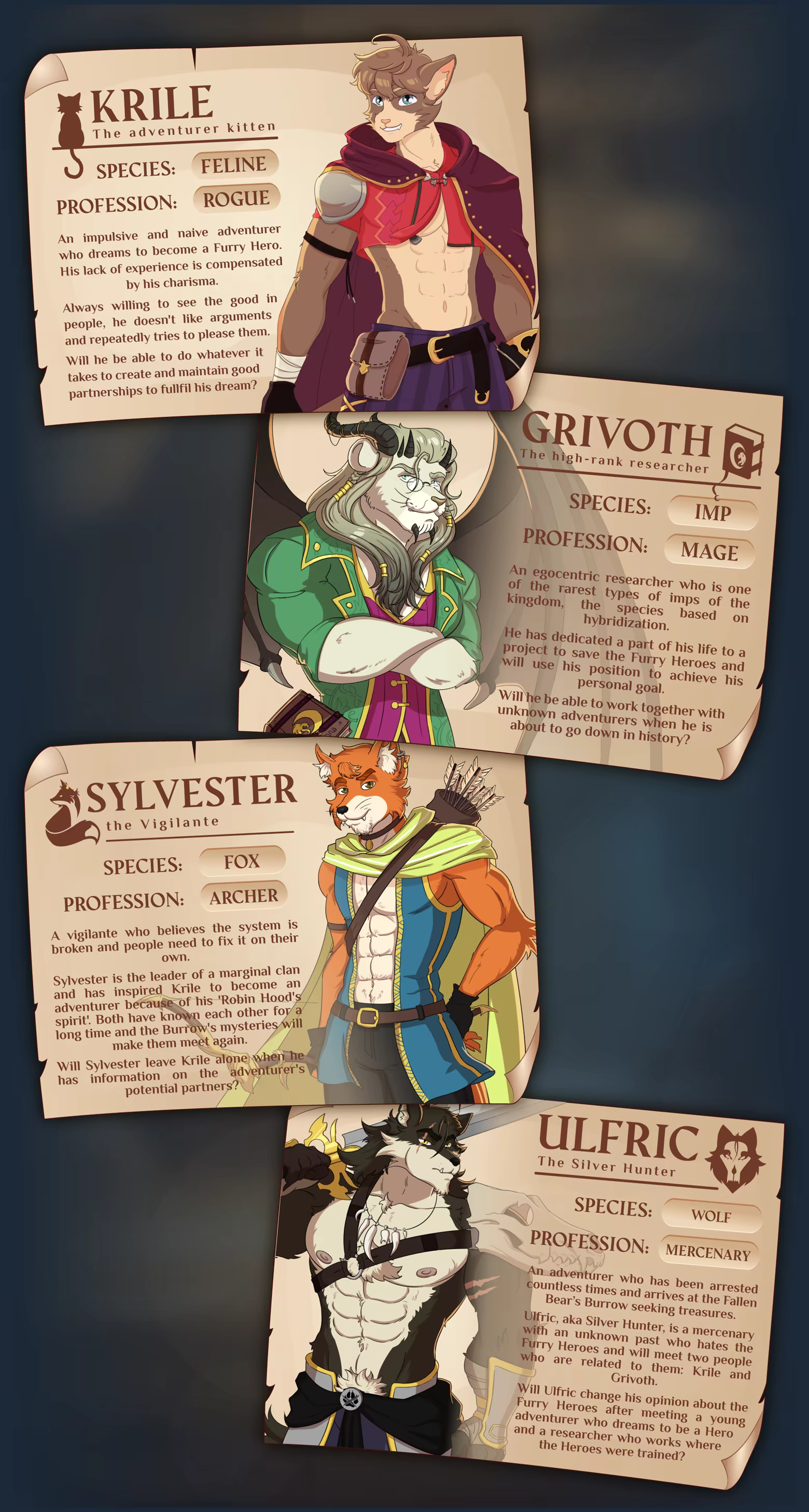 A gay furry visual novel, full of fantasy and RPG elements. Experience Krile’s journey before he saves the Furry Heroes, Meet 3 unique hot adventurers, Fight with them, Buy items that impact your story, Unlock branches, Explore the Fallen Bear’s burrow. Everything through a classic choice system.
