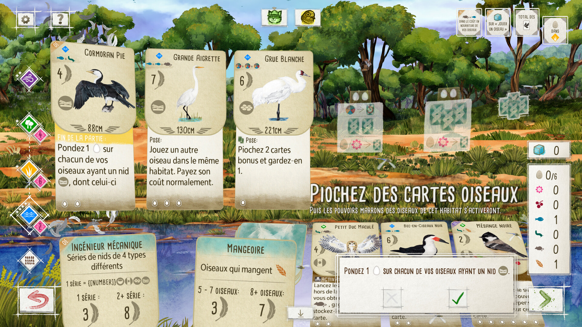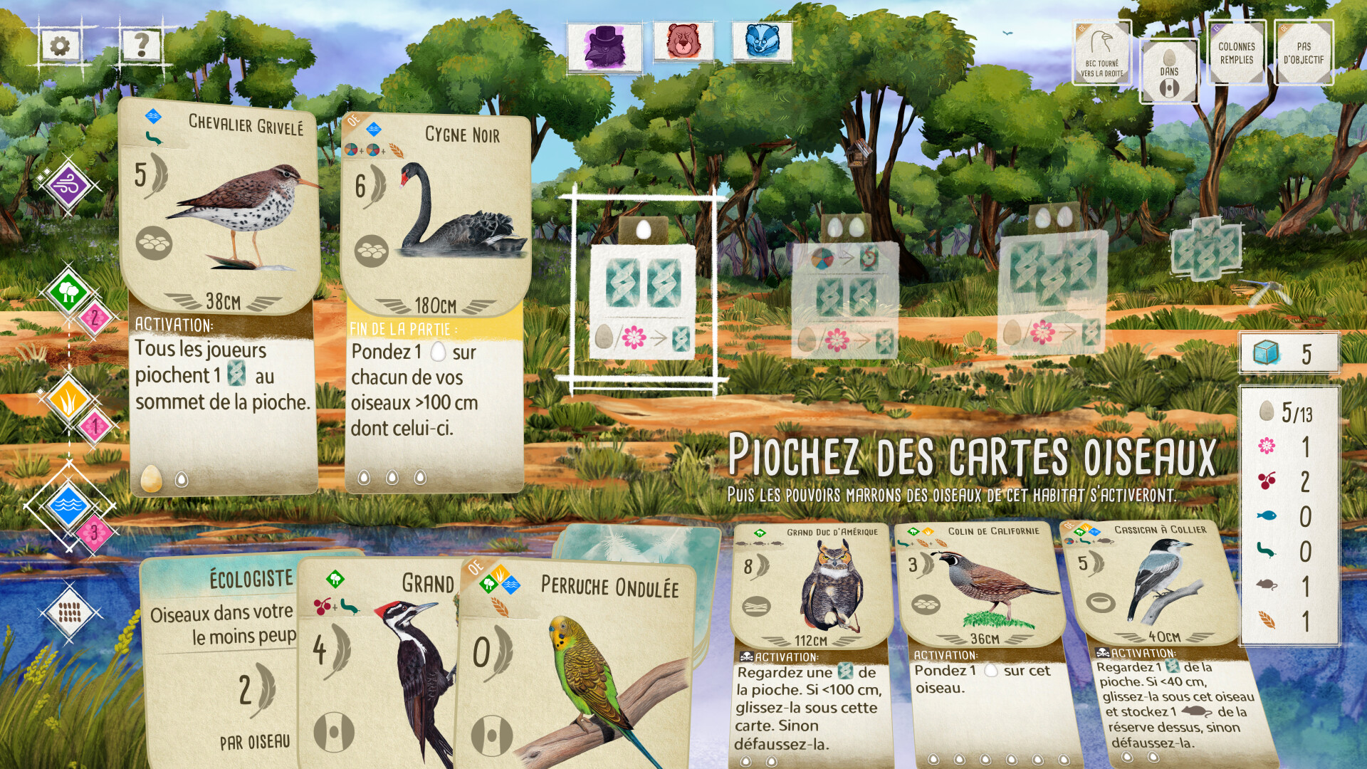 Le plateau de jeu présente maintenant un nouveau design et de nouvelles fonctionnalités. Vous y trouverez un endroit où ranger votre nectar, mais aussi des options pour réinitialiser la mangeoire des oiseaux et le plateau de cartes. Vous pourrez également obtenir plus de nourriture et de cartes plus rapidement qu’avant, tandis que le nombre d’œufs pondus est réduit. Tous ces changements diversifient la dynamique du jeu.
