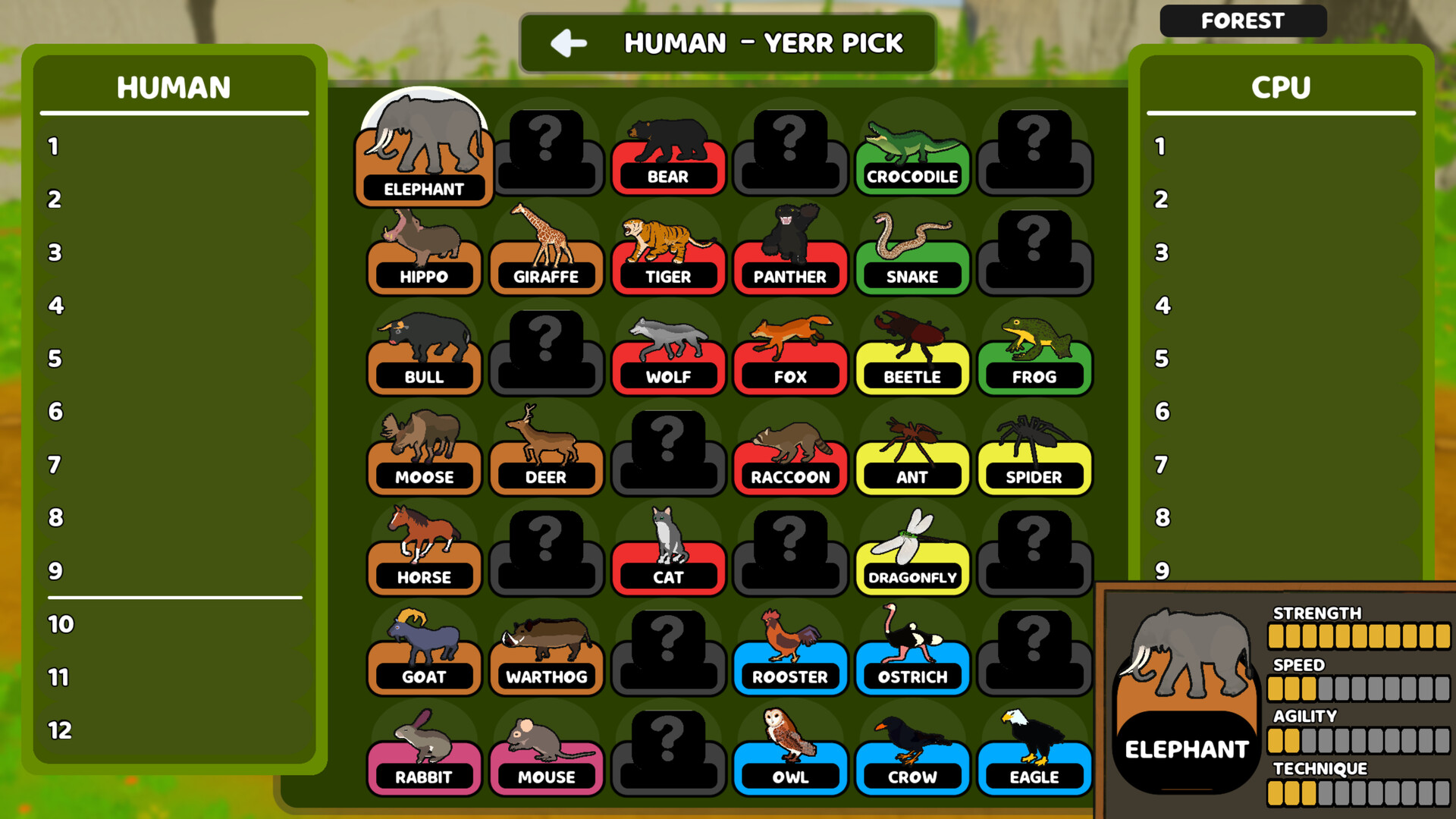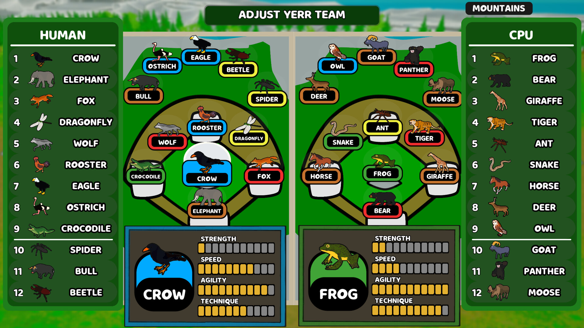 Inspired by the game of baseball, Yerr Out is a barnstormin' good time out on the ballfield. Choose from 30 different animals to assemble your team. Each character has different attributes which are categorized by STRENGTH, SPEED, AGILITY, TECHNIQUE