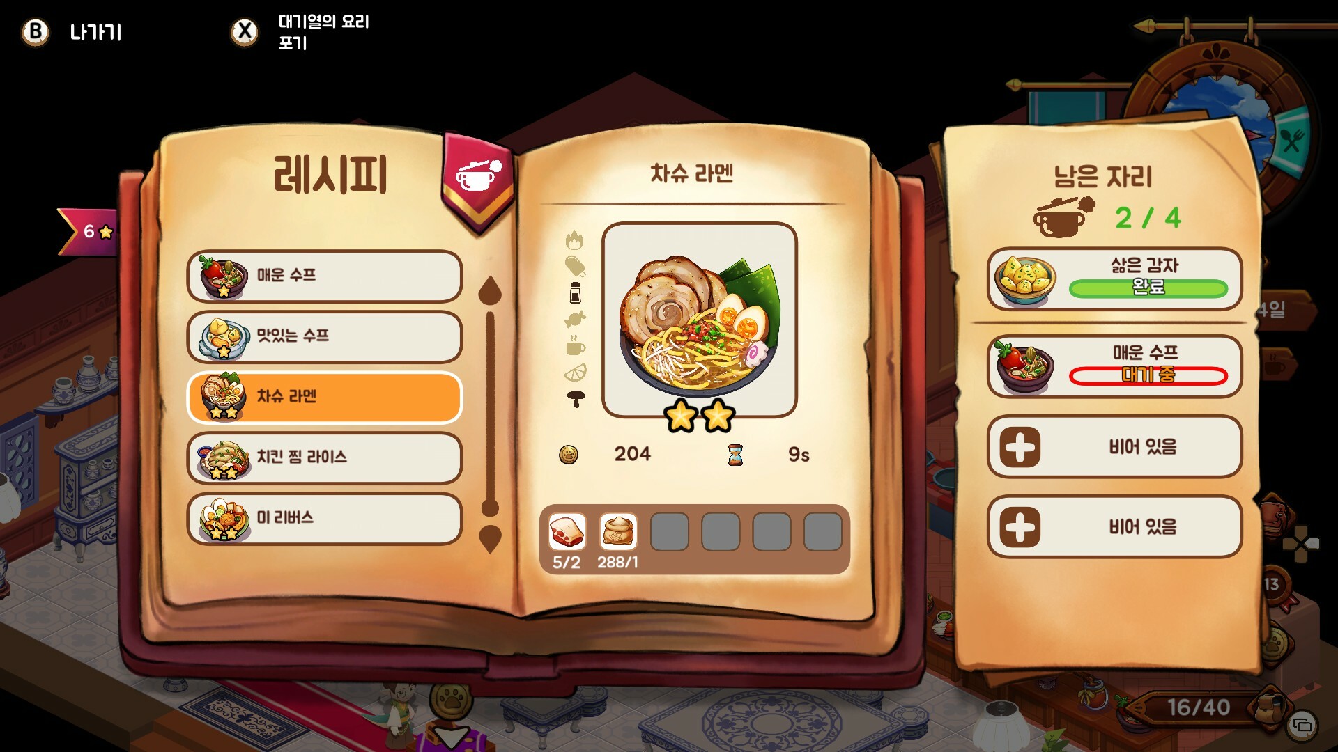 바삭바삭한 포피아 롤부터 진한 카야 잼, 상큼한 레몬을 곁들이고 두 번 튀겨 바삭한 치킨, 베리가 잔뜩 올라간 달콤한 간식까지 전 세계의 100가지가 넘는 다양한 레시피를 요리하세요. 올바른 고객에게 올바른 요리를 제공하고 현지 장인의 도움을 받아 주방과 홀을 커스터마이징하세요.