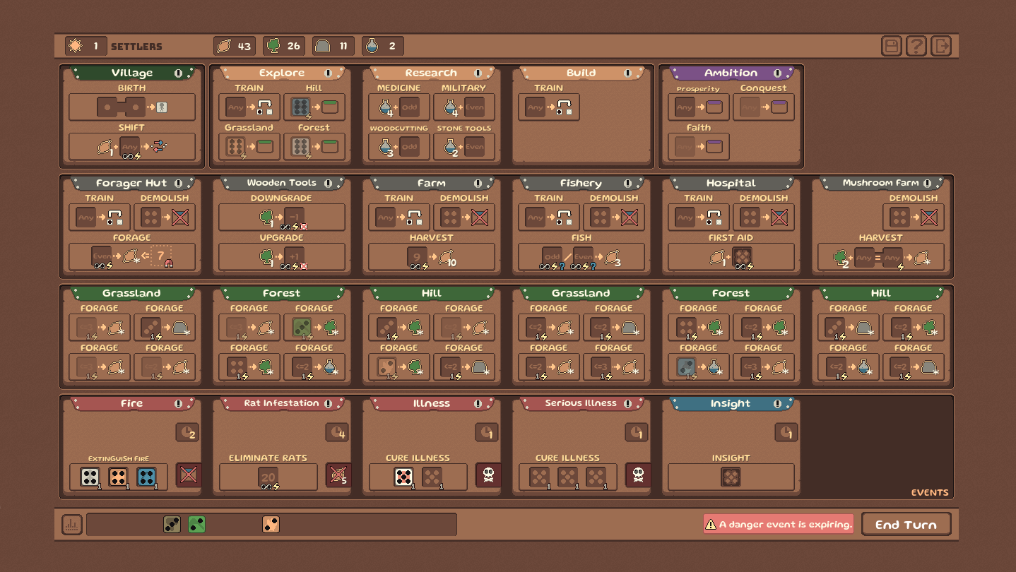 Starting with a small number of villagers, you will need to manage them and grow the tribes in order to complete one of the ambitions. Opportunities and Dangers lies ahead and you will need to dispatch your villagers to take care of them. Prepare your villagers as you attempt to complete one of the ambition to win the game.