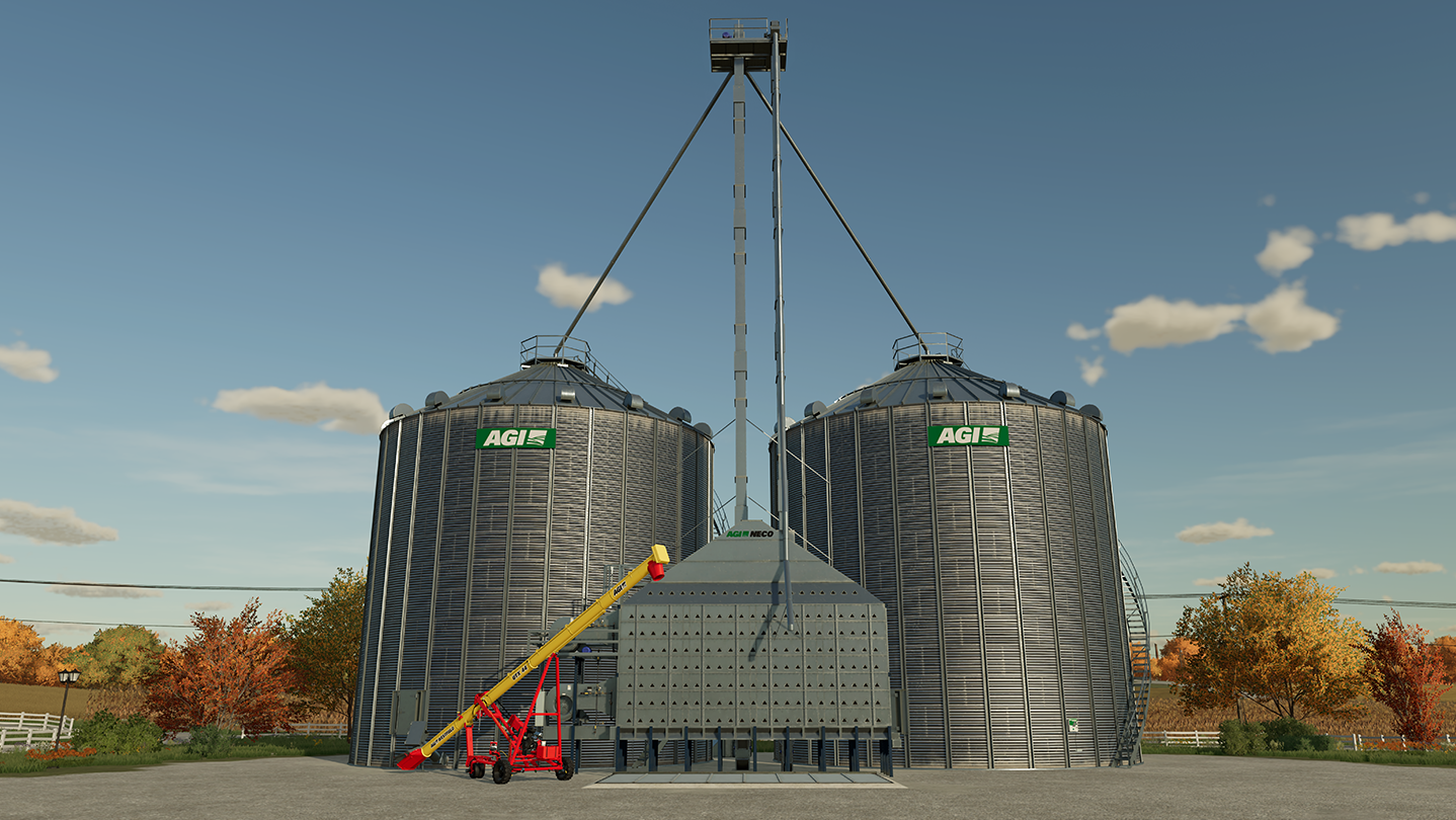 New machinery and new placeables to step up your grain-game: Get a diverse set of high-quality equipment and facilities by AGI - a leading manufacturer of portable and stationary grain handling, storage and conditioning equipment. Included in the free pack are augers, belt conveyors, grain storage bins, and a top-tier seed treater.