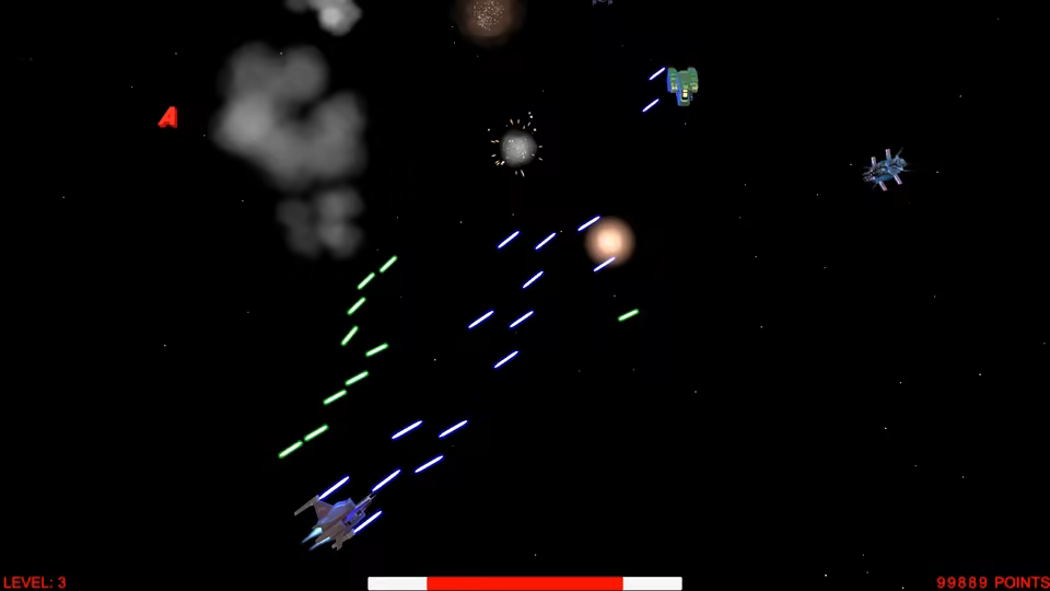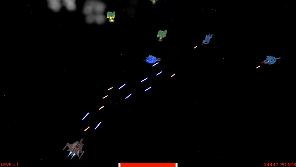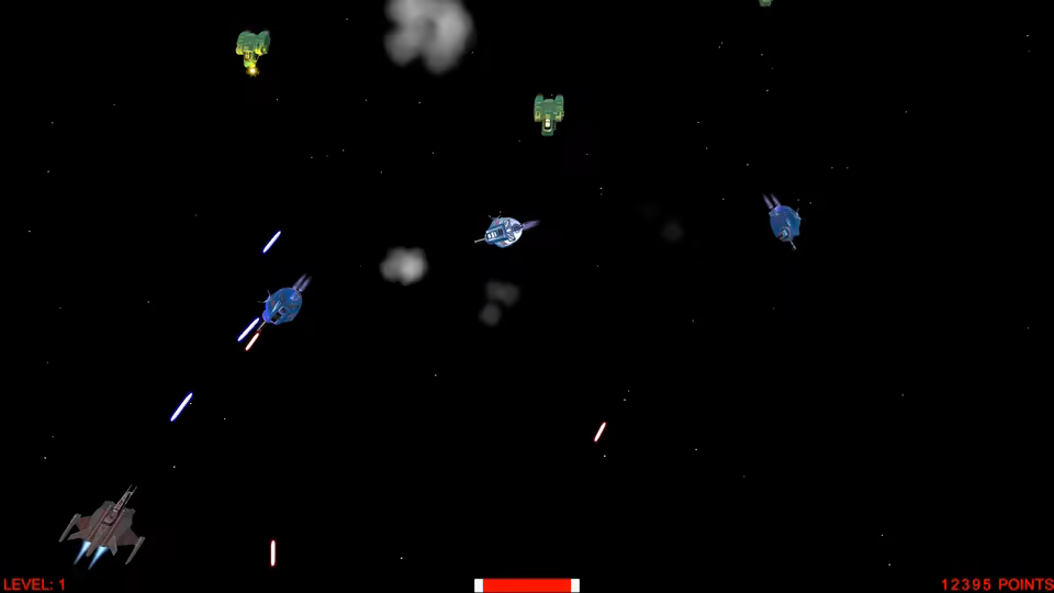 You'll start off with only a single, semi-auto laser cannon. As you take out more enemies, you'll have the opportunity to upgrade your ship by collecting powerups. You can get additional laser cannons, bursts of automatic fire, and eventually full auto. You'll also be given a larger health bar halfway through each level, so you can take on more powerful enemies.