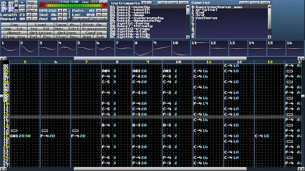 I created this soundtrack using samples I made on a Korg Volca FM synth (FM Synthesis is the same kind of synth used in the Sega Genesis/Megadrive), as well as samples from a 90's era Alesis QS6 and a Boss Dr. Rhythm DR-670. These samples are then loaded into a clone of a 90's era tracker, FastTracker 2, called MilkyTracker. This is what the tracker looks like: