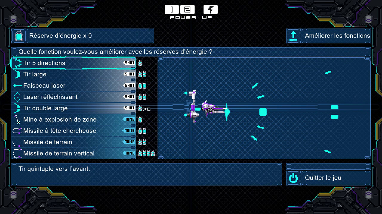 This is a side-scrolling shooting game in which the player takes control of the "Drainus", a ship that can absorb energy bullets, to take down the countless enemy ships zipping through space. Energy absorbed can be used to enhance the ship's functions, such as adding new weapons.