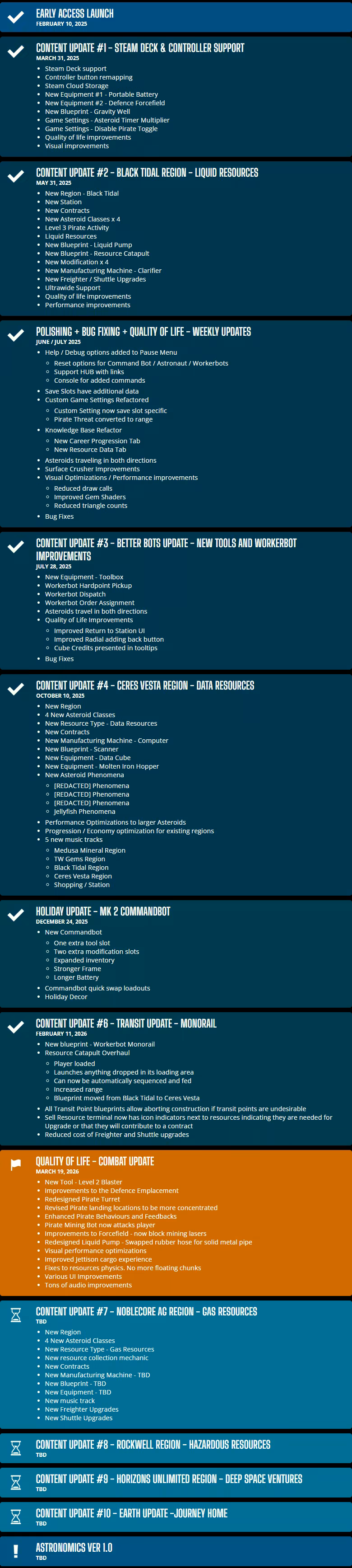 «We initially had planned for the game to be playable from start to finish but over the course of playtesting have expanded the scope and now this Early Access release will contain only the first 3 regions with the first 12 asteroid classes along with plenty of contracts, tools, equipment and upgrades for players to get into. In total we have 7 regions planned and will be opening up the game to new regions with each content update as we go.