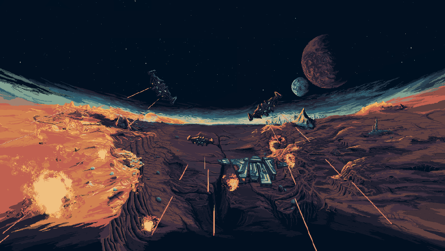 Destroy your enemies, fly low to boost your engines, and reach Frontier outposts to refuel, upgrade your airship, and find the next challenge. In VergeWorld high replayability mixes with the nostalgic retro feeling of PSX-era 3D visuals, pixel art story screens, 16-bit tunes, and a synthwave soundtrack.
