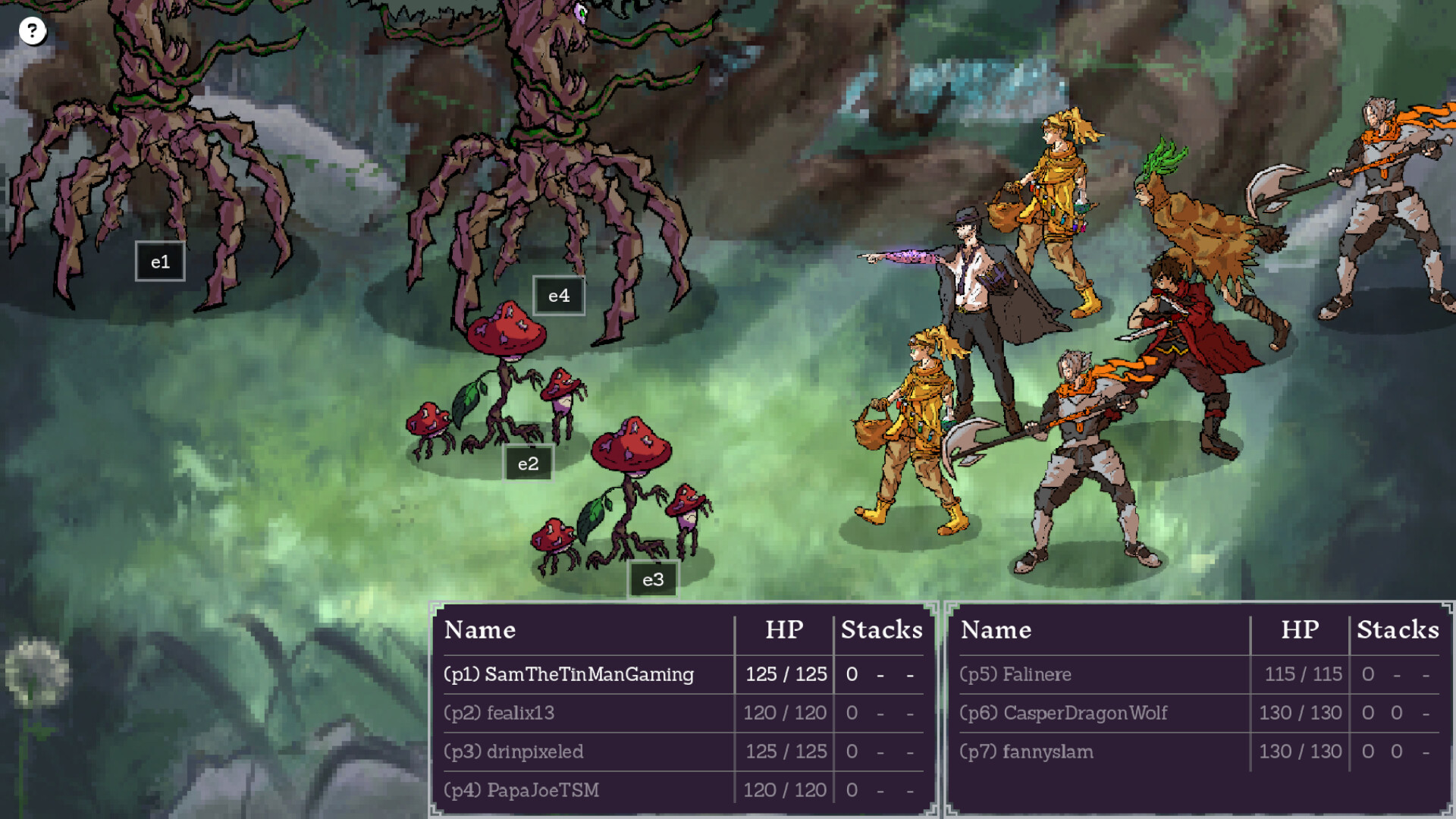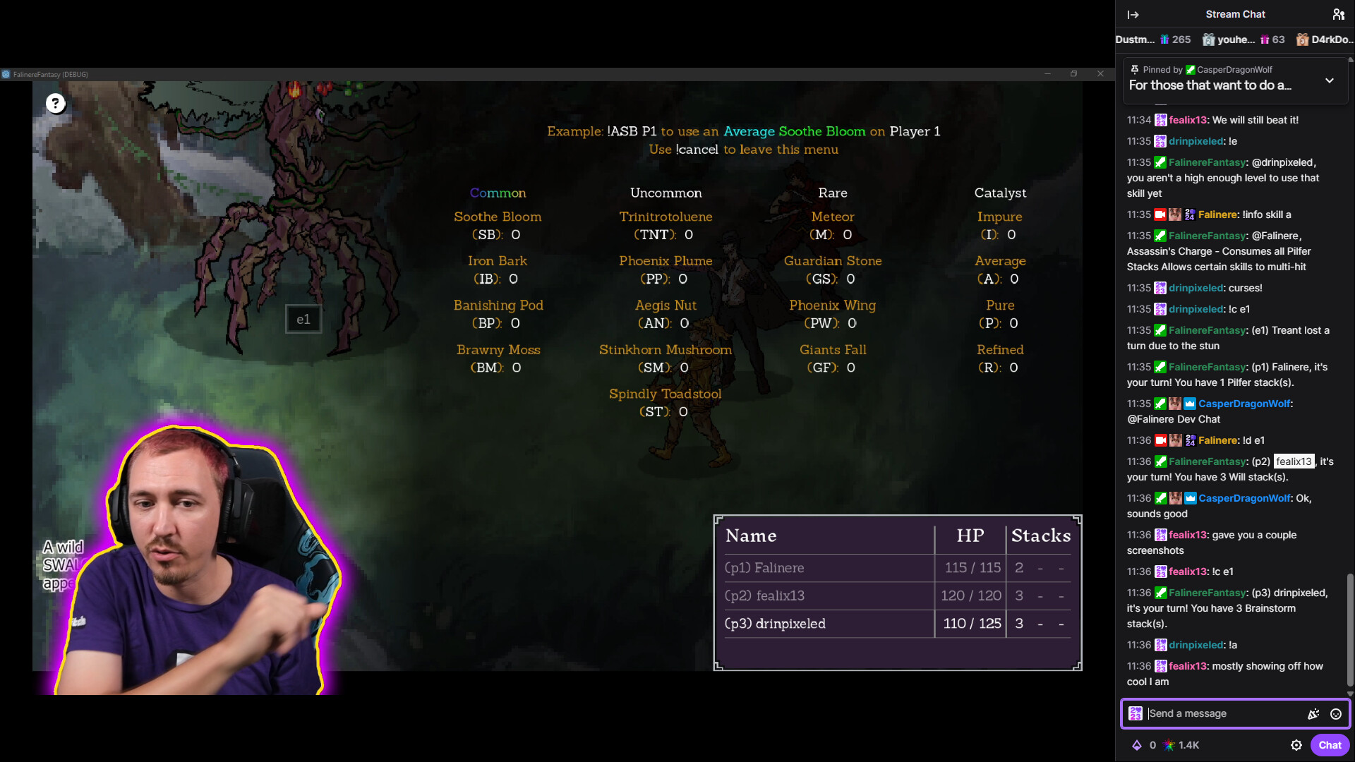Falinere Fantasy is a turn-based RPG Dungeon Crawler played via Twitch Chat. Your viewers can change between 8 different classes (Alchemist, Bard, Crystalsmith, Druid, Rogue, Solicitor, Warrior, and Wizard) and run through dungeons, leveling up and gaining skills as they traverse the land.